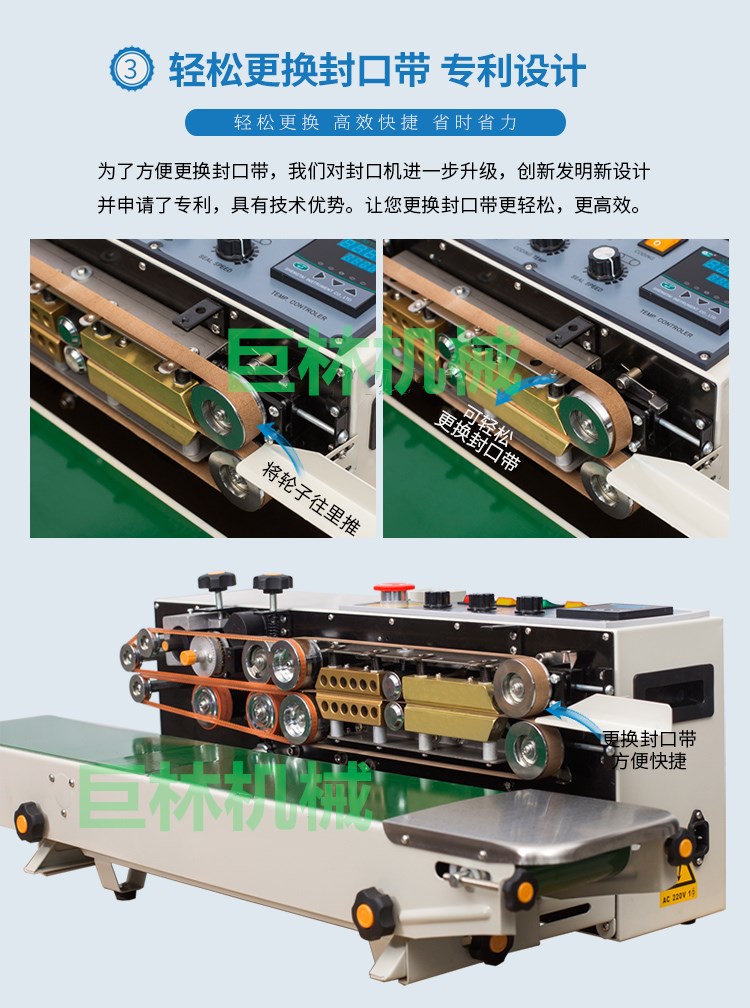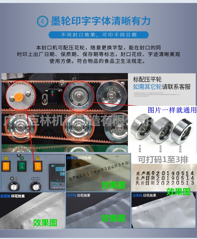 產(chǎn)品說(shuō)明 本機(jī)是新一代集印碼,封口,連續(xù)輸送為一體的自動(dòng)薄膜封口機(jī),具有印字清晰、顔色可選、即印即干、換字方便等特點(diǎn)。 技術(shù)參數(shù)