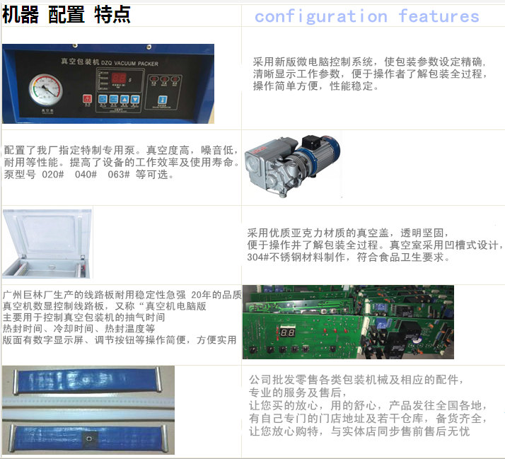 使用說明;1.插上電源插頭.交流220伏.2.打開電源按扭于開位置.3.調(diào)節(jié)抽氣時間(一般30-35秒左右).4.調(diào)節(jié)加熱(封口)時間(一般2.5-3.5秒).5.裝好物品.放置箱內(nèi)在封口處.6.按(壓)下頂蓋(有機(jī)玻璃蓋.看到真空表指針走動手松開)即可自動操作.真空表回零即工作完成.